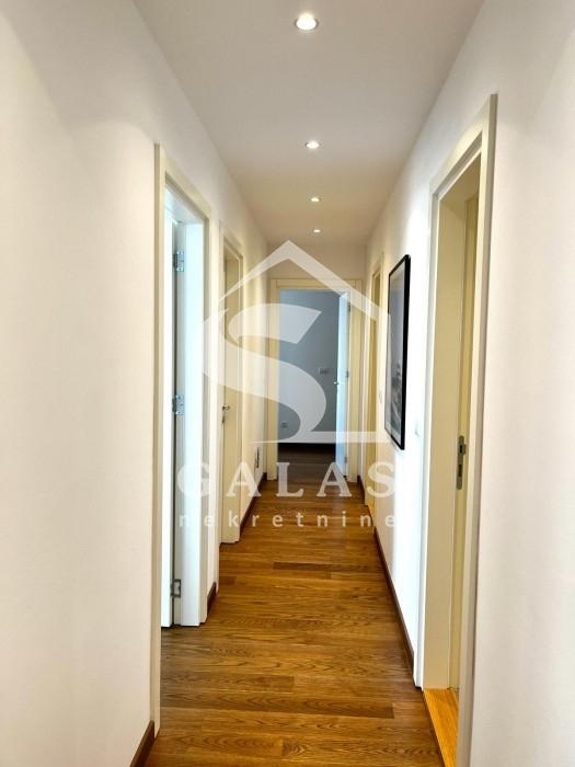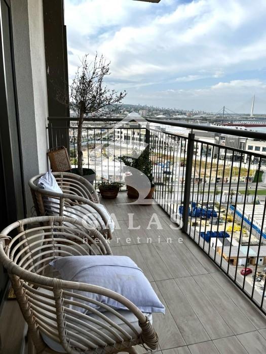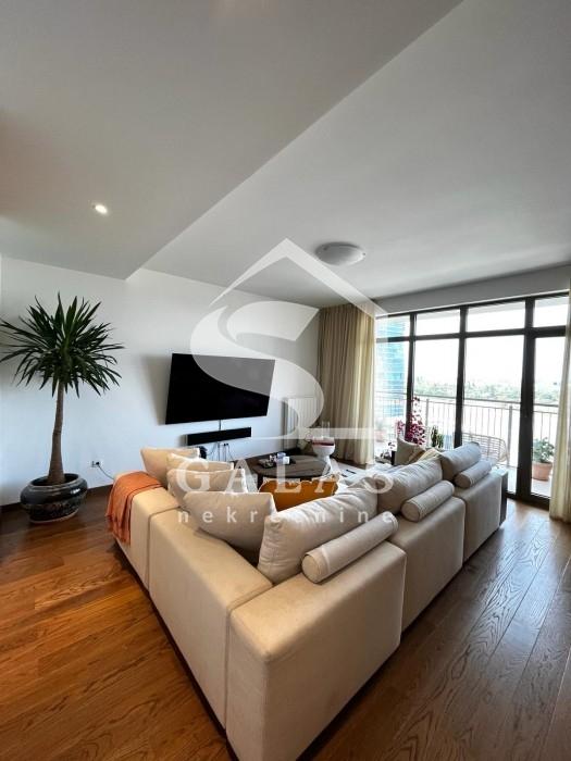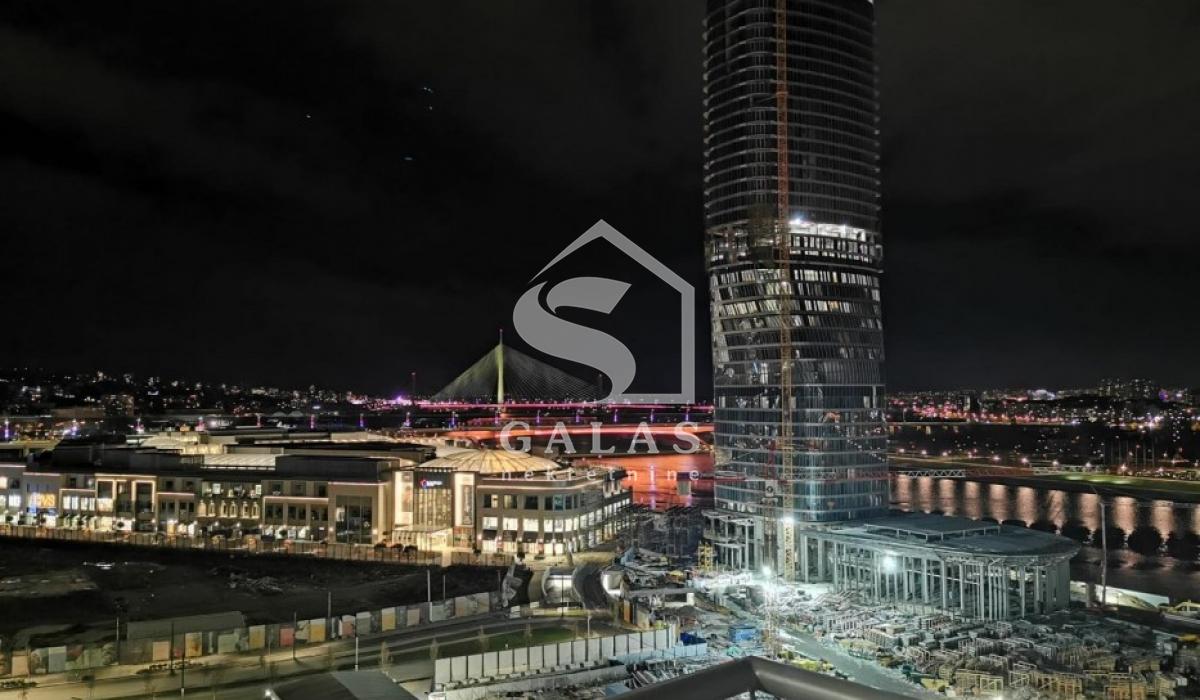 This luxury apartment is located in the Arcadia building. The building is in an excellent position and has its own reception. The apartment is located on the 13th/24th floor, from where there is a phenomenal view of the river, the tower and the city. Bright, spacious, comfortable and luxurious, it consists of: living room, kitchen, dining room, separate sleeping block with 3 bedrooms, 2 bathrooms and toilet. There are also two terraces as well as a storage room. The apartment comes with a basement and 2 garage spaces, which are included in the price.