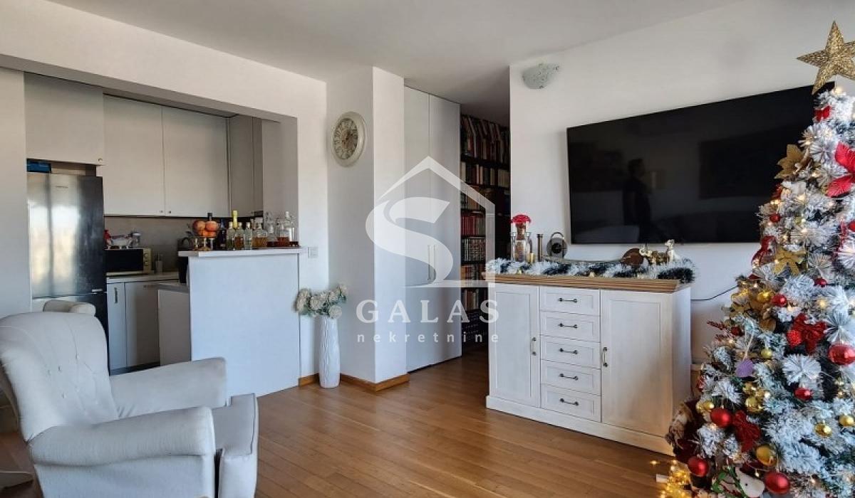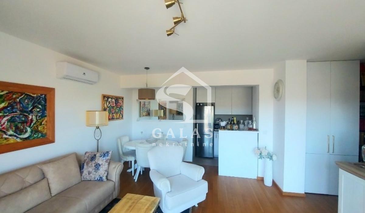 Uživajte u prelepom pogledu i iz dnevne sobe, od koje je kuhinja malo izdvojena što je estetski odlično. Dve spavaće sobe pružaju savršen komfor i privatnost, dok luksuzni materijali i pažljivo birani detalji stvaraju sofisticiranu atmosferu. Iz hodnika se ulazi u sve prostorije i komforno kupatilo sa tuš kabinom.
