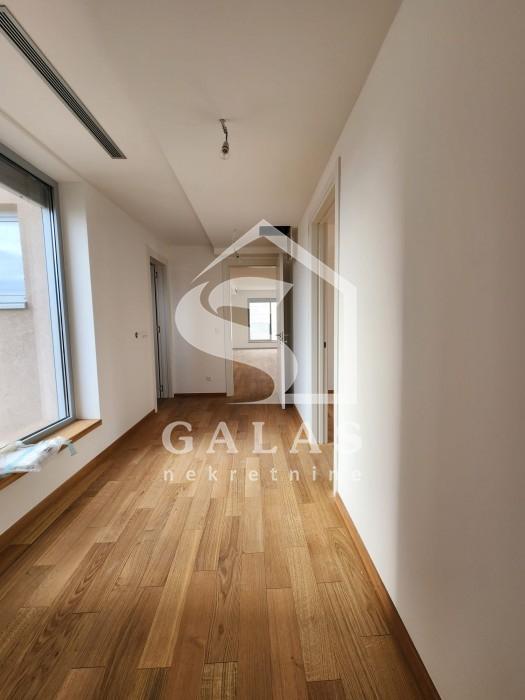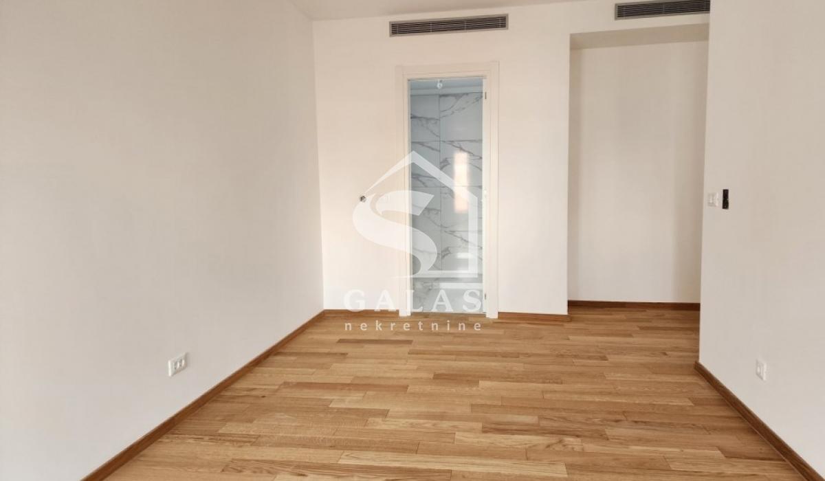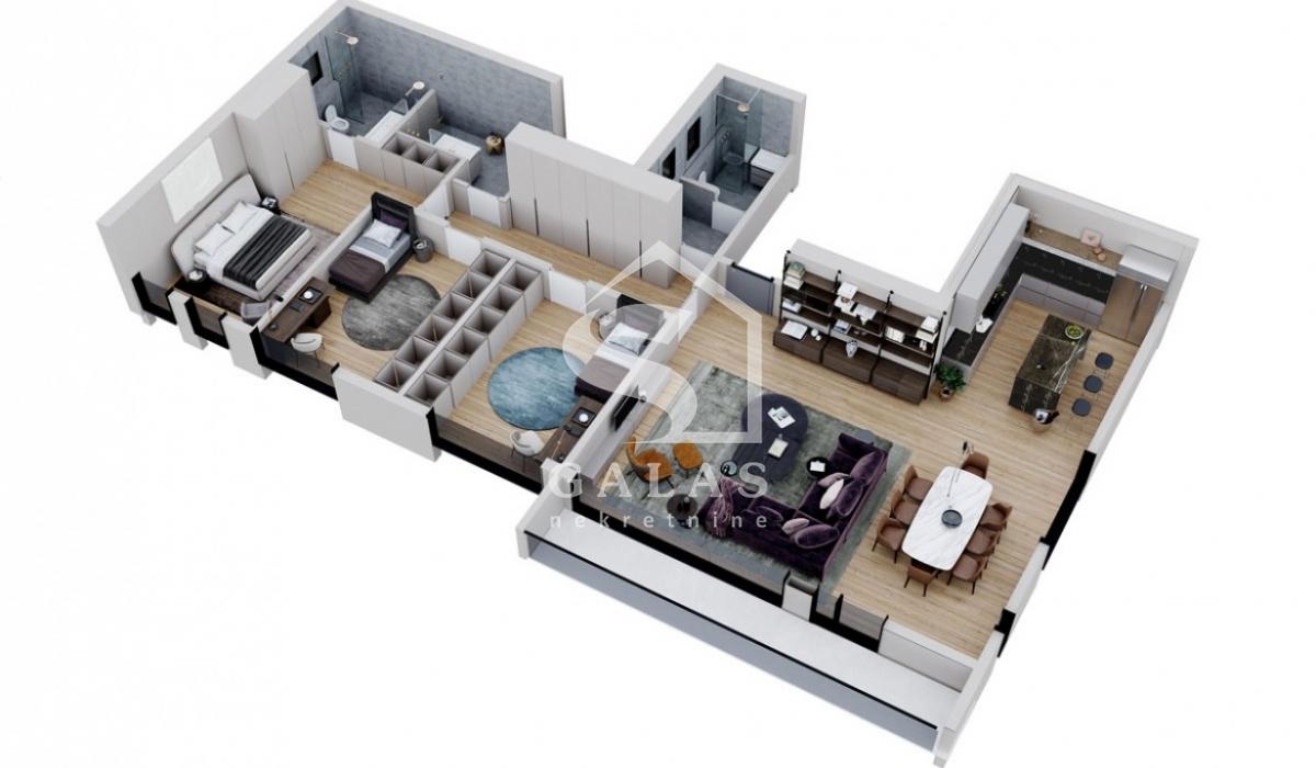Dvostrano orijentisan stan sa dnevnim boravkom od 63m2 sa staklima od poda do plafona što ga čini jako svetlim i daje mu posebnu crtu luxuza. Tri spavaće sobe od koje je jedna master soba, kuhinja, ostava, hodnik, terasa i 3 kupatila.