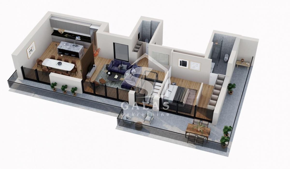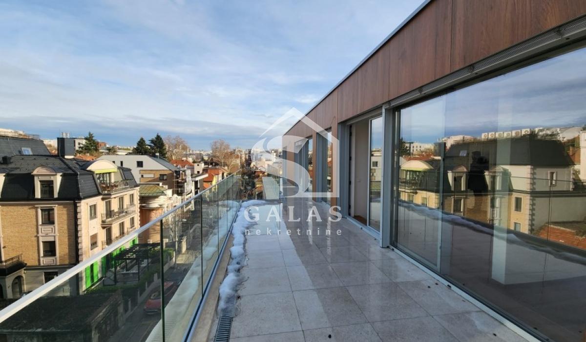 Trostrano orijentisan penthaus sa dnevnim boravkom od 70m2 sa staklima od poda do plafona što ga čini jako svetlim i daje mu posebnu crtu luxuza. Tri spavaće sobe od kojih su dve master sobe, ukupno tri kupatila i toalet, kuhinja i terasa površine 55m2 sa koje se pruža prelep pogled.