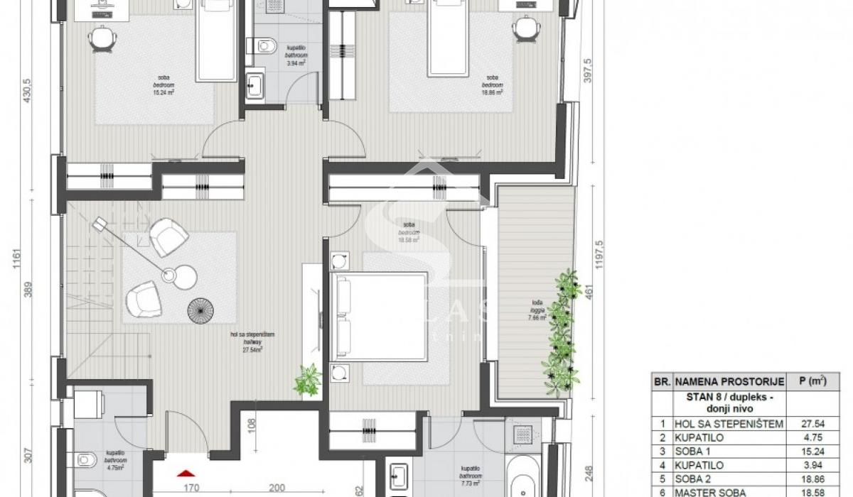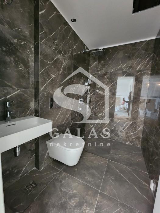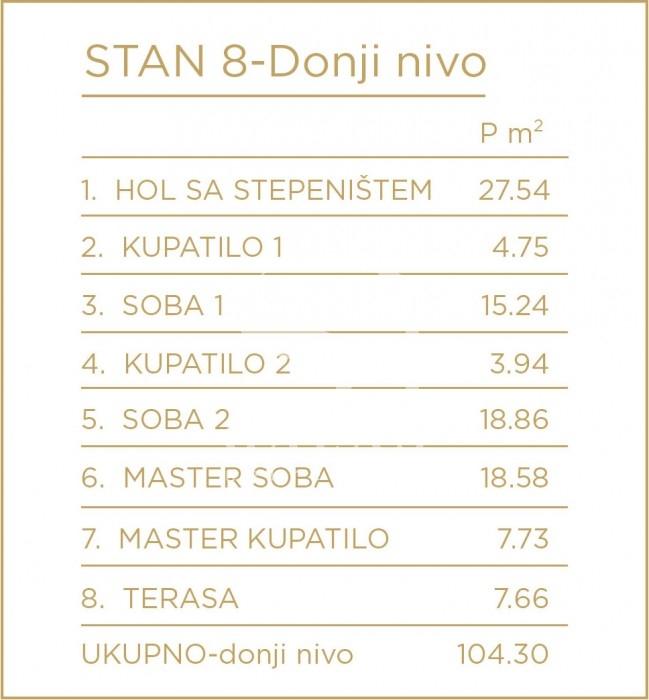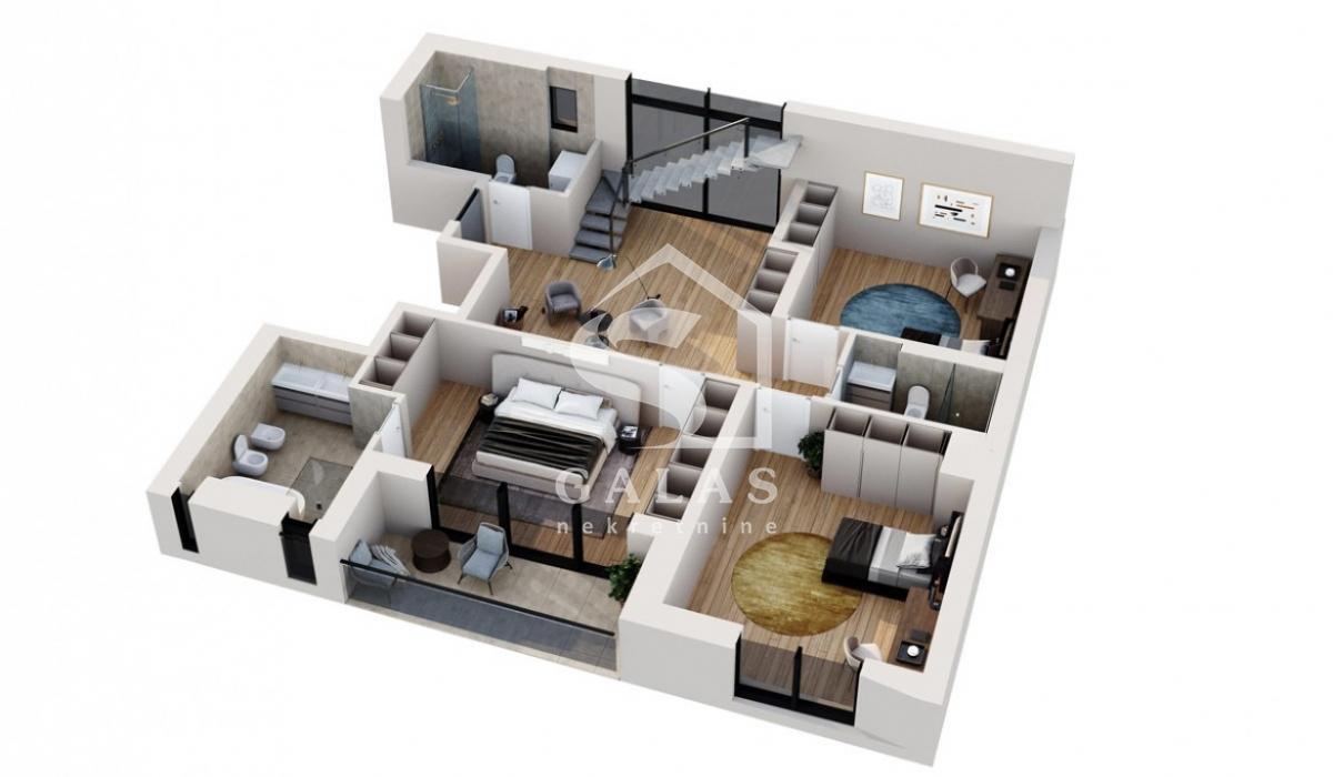 Trostrano orijentisan penthaus sa dnevnim boravkom od 80m2 sa staklima od poda do plafona što ga čini jako svetlim i daje mu posebnu crtu luxuza. Tri spavaće sobe od kojih je jedna master soba a ukupno tri kupatila, kuhinja i 2 terase, manja na donjem nivou i veća na gornjem nivou.